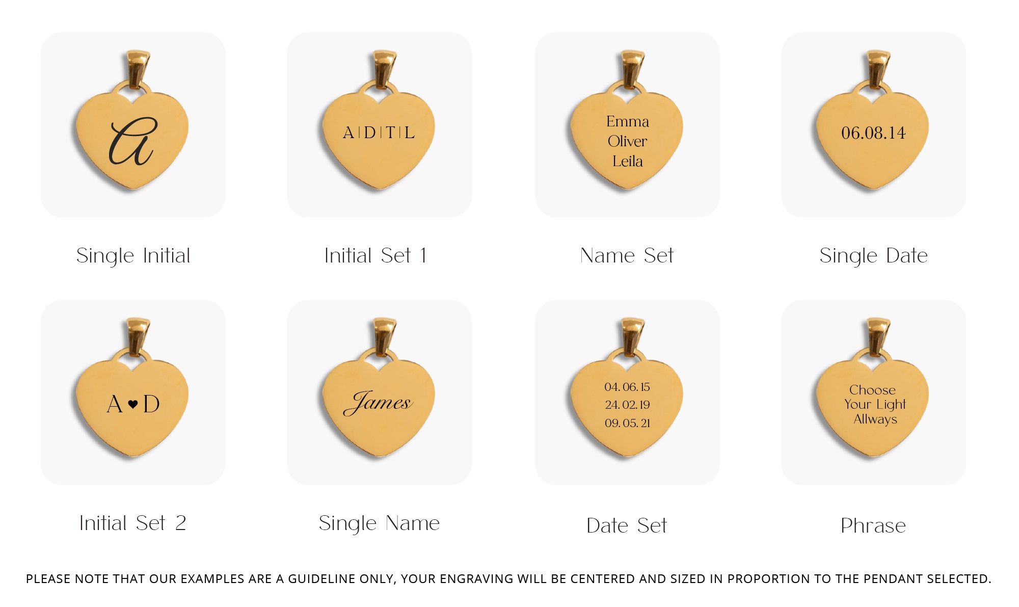Our examples are a guideline only, to ensure you are happy with your font selection and engraving text, please note that your engraving will be centered and sized in proportion to the pendant selected.