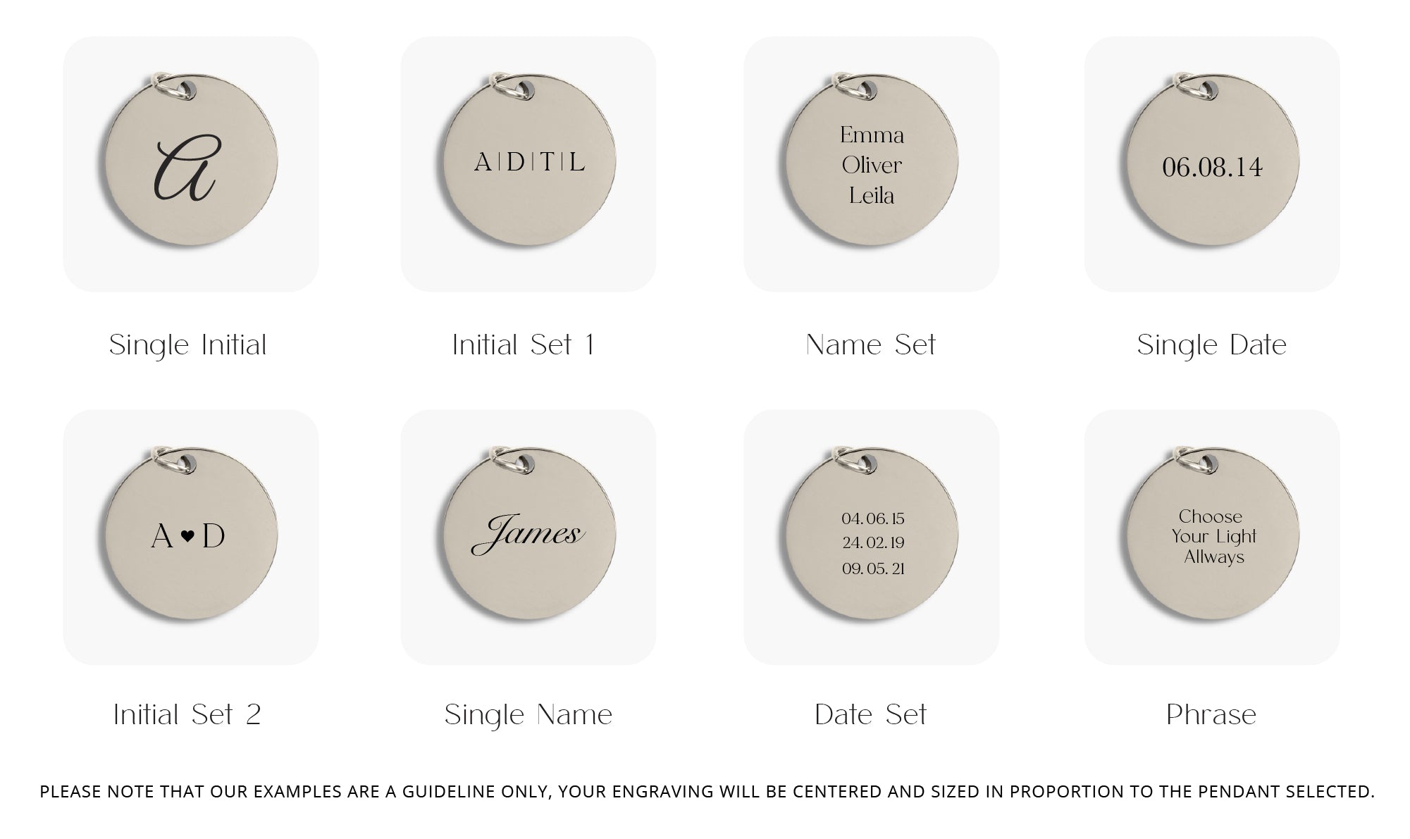 Our examples are a guideline only, to ensure you are happy with your font selection and engraving text, please note that your engraving will be centered and sized in proportion to the pendant selected.