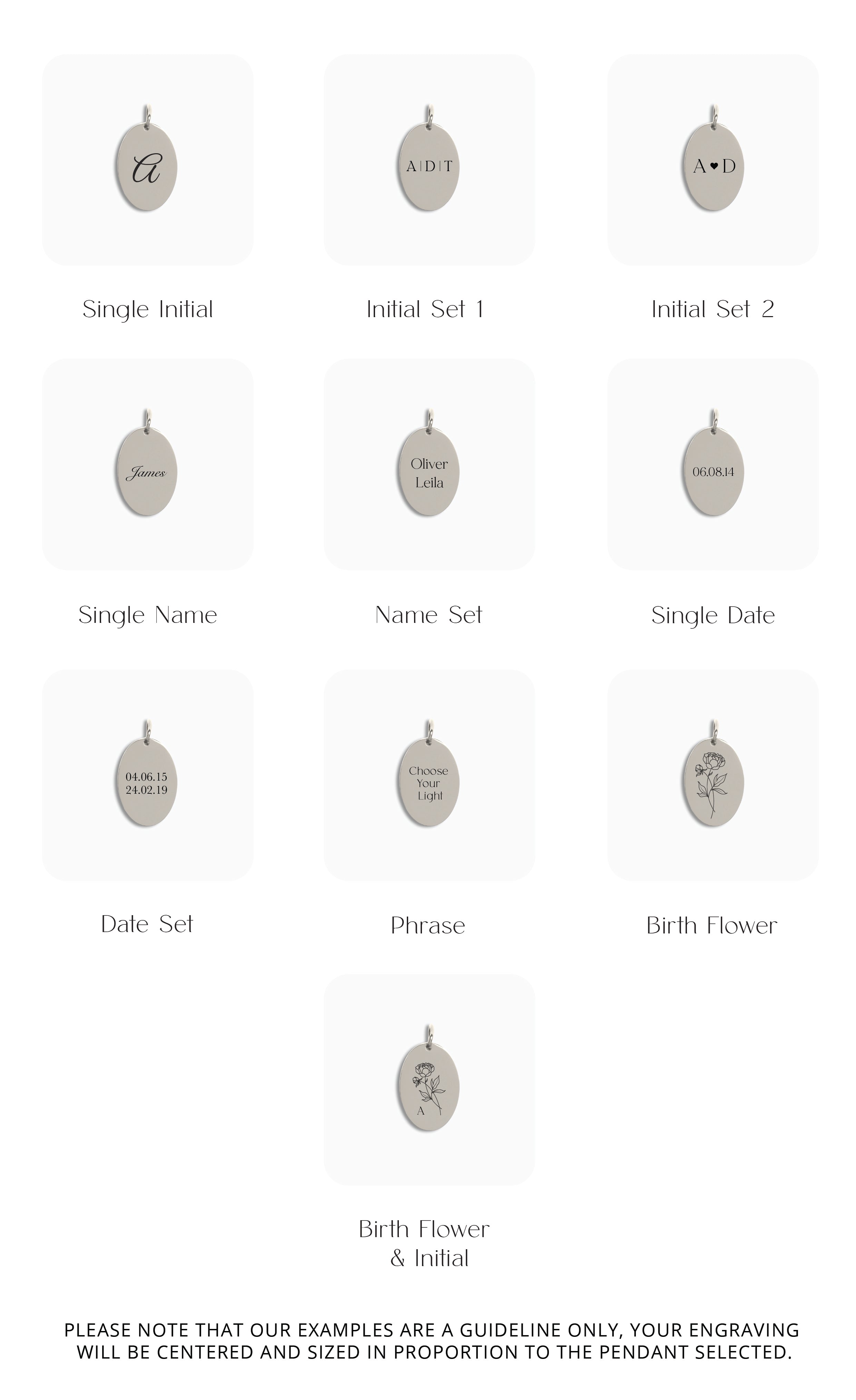 Our examples are a guideline only, to ensure you are happy with your font selection and engraving text, please note that your engraving will be centered and sized in proportion to the pendant selected.