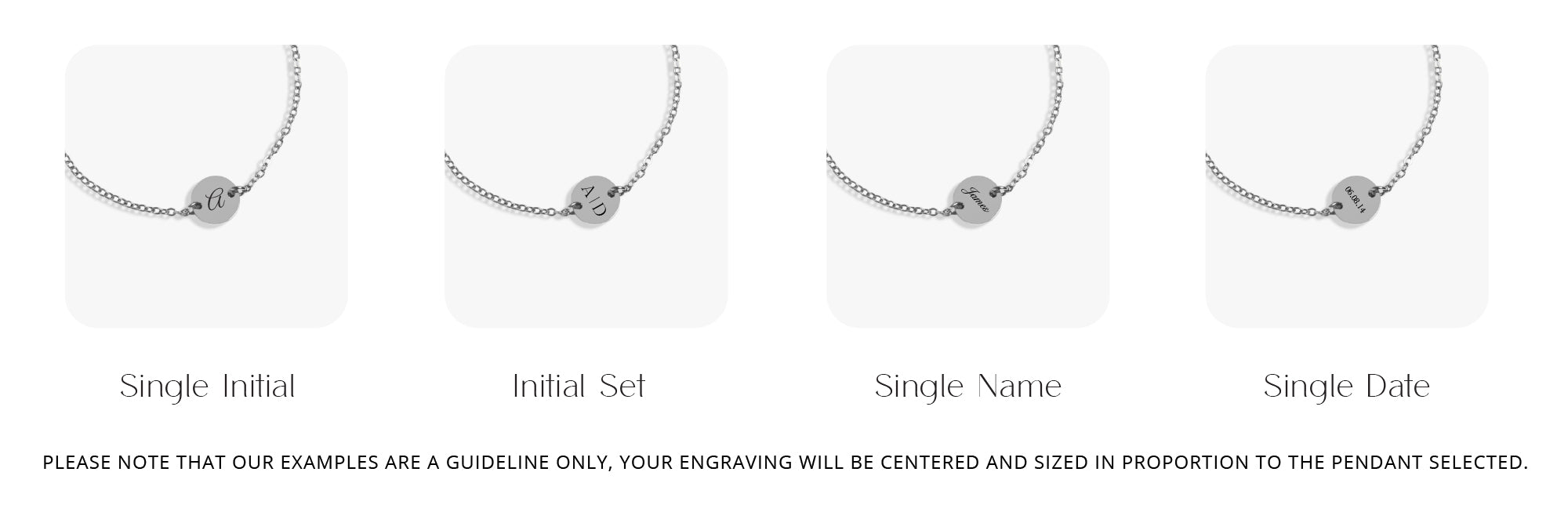 Our examples are a guideline only, to ensure you are happy with your font selection and engraving text, please note that your engraving will be centered and sized in proportion to the pendant selected.