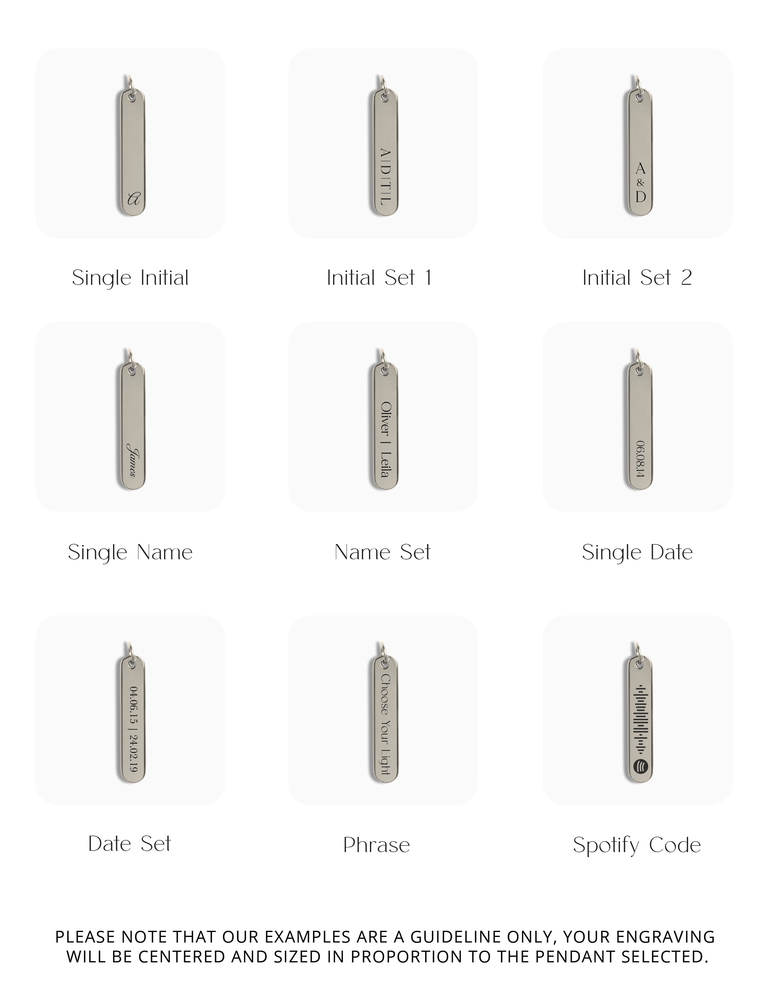 Our examples are a guideline only, to ensure you are happy with your font selection and engraving text, please note that your engraving will be centered and sized in proportion to the pendant selected.