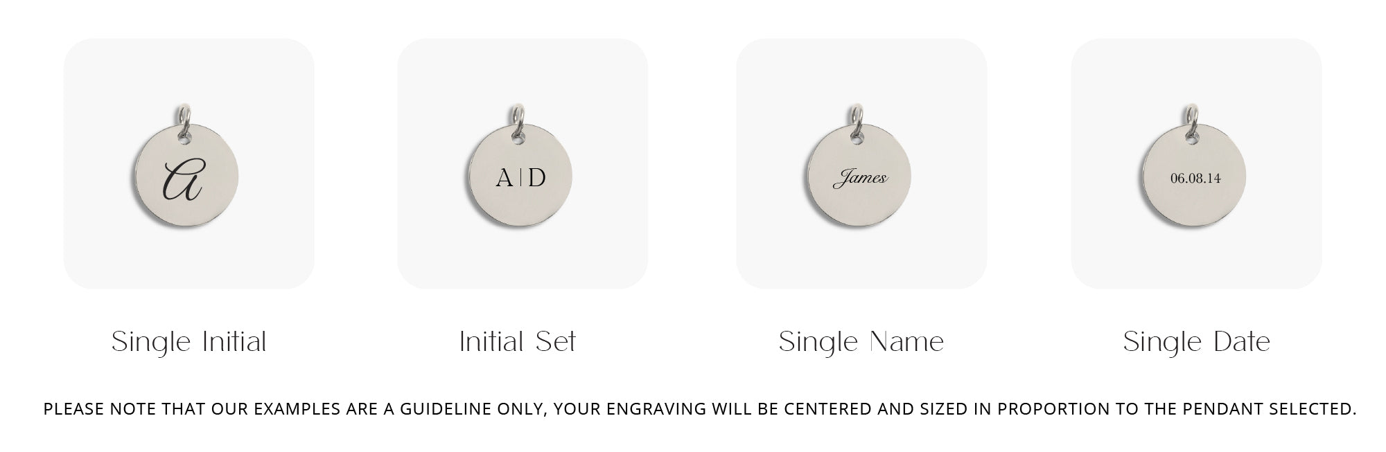 Our examples are a guideline only, to ensure you are happy with your font selection and engraving text, please note that your engraving will be centered and sized in proportion to the pendant selected.